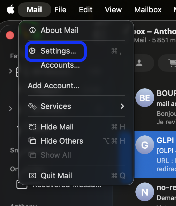 L’application une fois lancée, allez en haut de l’écran à gauche à côté du Logo et cliquez sur Mail puis Paramétres