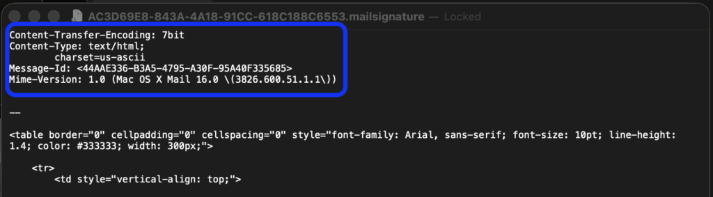 Une fois le fichier ouvert garder le dessus du document comme ci-contre et supprimez-remplacez ce qu’il y a en dessous avec le code de la signature préalablement créé et copié