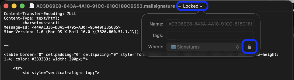 Enregistrez et pensez à cliquer sur la flêche à côté du titre du document en haut de la fenêtre. Cliquez sur le cadenas pour activer le blocage pour que l’application Mail ne modifie pas le fichier