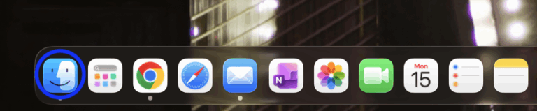 Aprés ces étapes assurez vous d’être sur Finder, pour en être sur, vous pouvez cliquer sur le logo bleu en bas à gauche par défaut et vous assurer que “Finder“ est écrit tout en haut à gauche de l’écran à coté du Logo